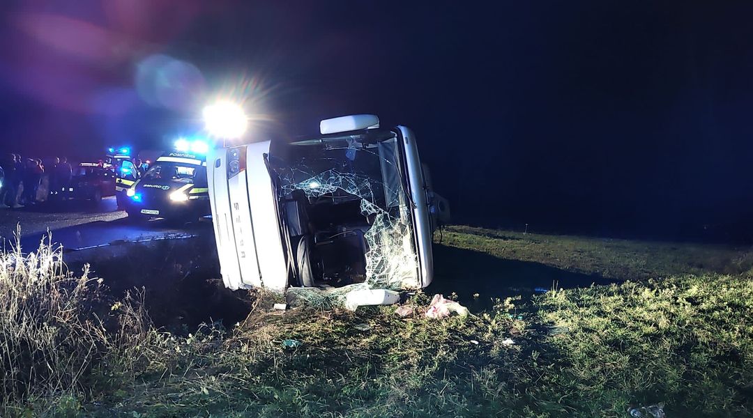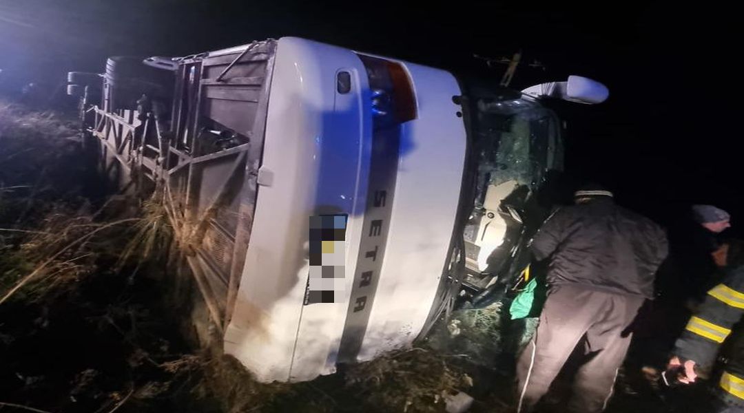 Grav accident de circulatie, sambata seara, in judetul Arad. Un autocar plin cu oameni s-a rasturnat pe marginea soselei.
