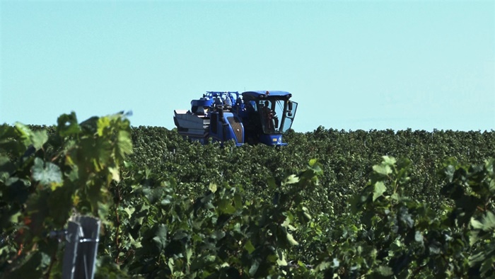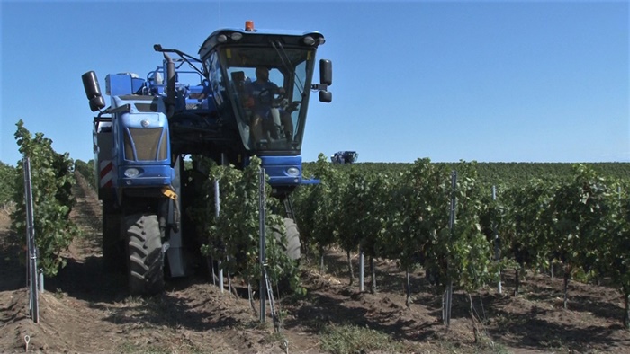 Si, pentru ca recoltarea sa mearga cat mai repede, strugurii sunt culesi doar in sistem mecanizat.