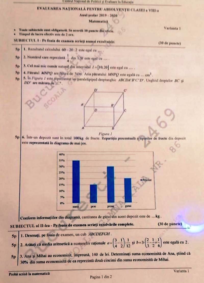La primul dintre acestea absolventii au trebuit sa rezolve doua calcule simple, care implicau operatiune de scadere, impartire sau fractii. Un alt subiect le cerea elevilor sa spuna care este masura unghiului dintre doua drepte intr-un paralelipiped dreptunghic.
