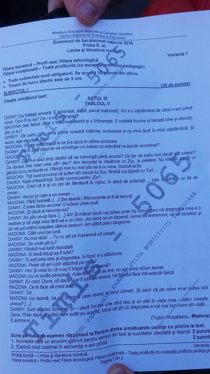 Iata mai jos subiectele de la Romana scris, profil Uman, BAC 2016!