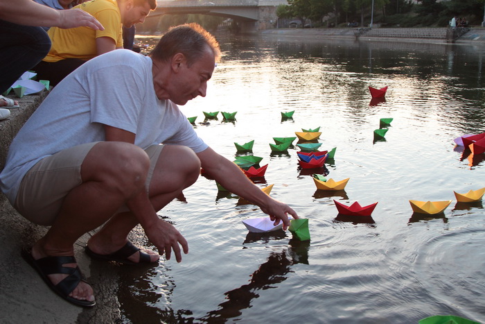 TIMISOARA. Aproximativ 30 de tineri, membrii si simpatizanti ai USL Timis, au lansat, joi seara, pe Canalul Bega, aproximativ o mie de barcute colorate, din hartie, care reprezinta „Flota lui Traian Basescu”.
