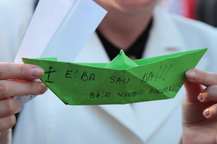 Presedintele PNL Timis, Liviu Cocean a tinut un discurs intrerupt in repetate randuri de lozinci precum „Jos Basescu”, „Pleaca din tara javra ordinara” si altele. In timpul discursului sau, barcutele au fost lansate la apa de cei aproximativ 30 de tineri prezenti.