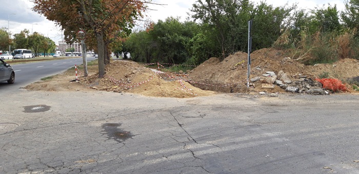 In august, muncitorii firmei angajata de ENEL au astupat cu pamant santul in care au fost ingropate niste cabluri de curent si au turnat, cu greu, un strat de asfalt prost. In urma lor, potopul. A ramas blocat trotuarul.