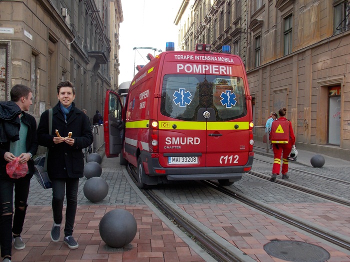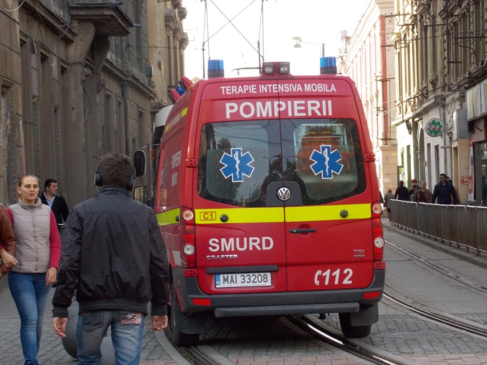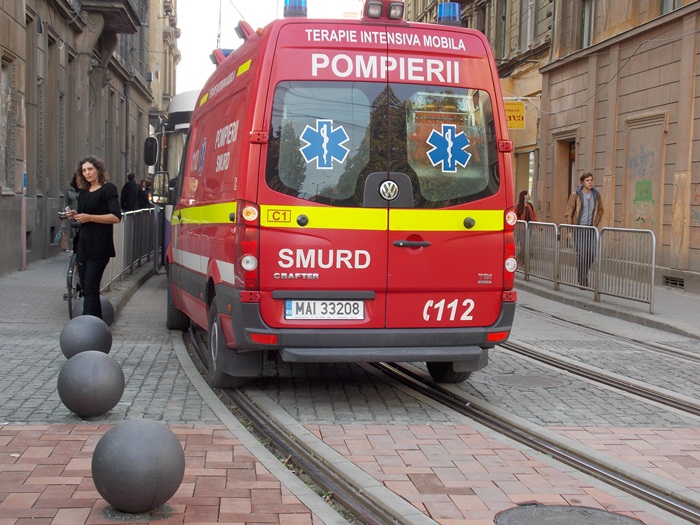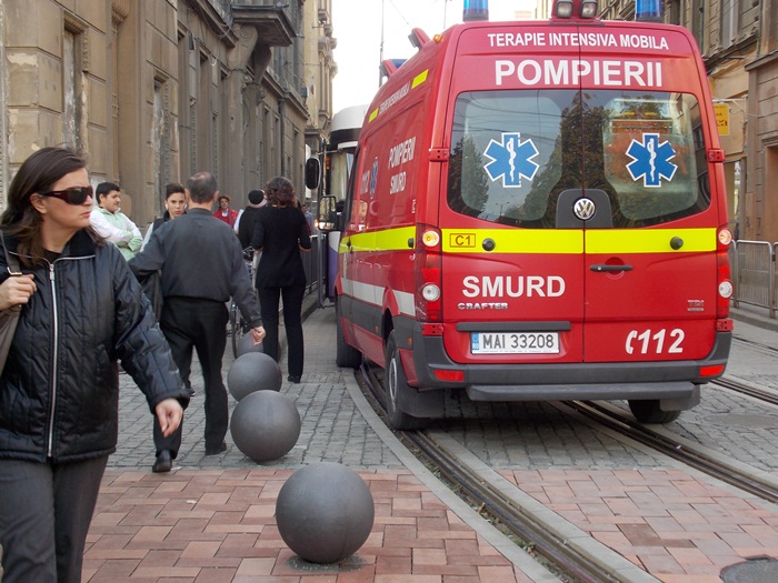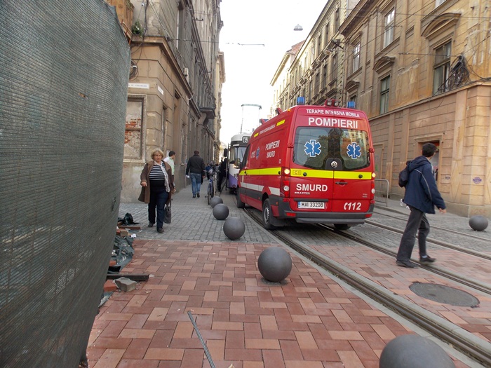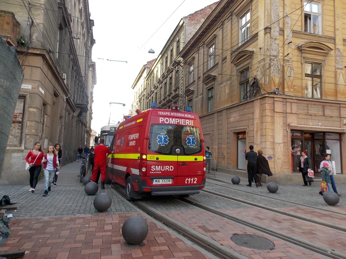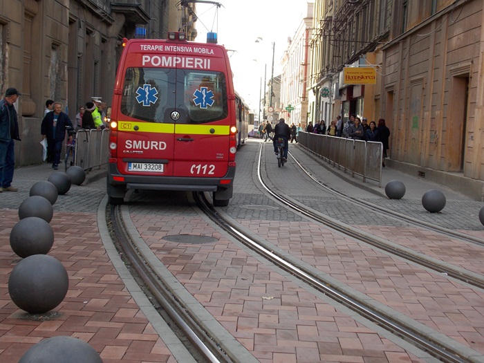 Un echipaj SMURD sosit in mare graba sa acorde primul ajutor unui timisorean care suferise un infarct a fost nevoit sa opreasca exact pe liniile de tramvai pentru ca altfel nu avea unde sa parcheze, din pricina bilelor metalice.