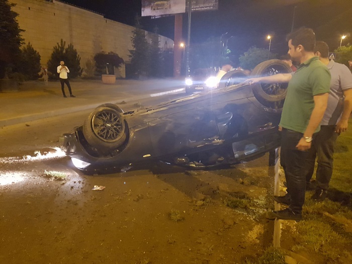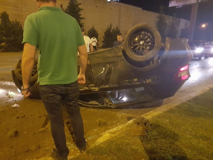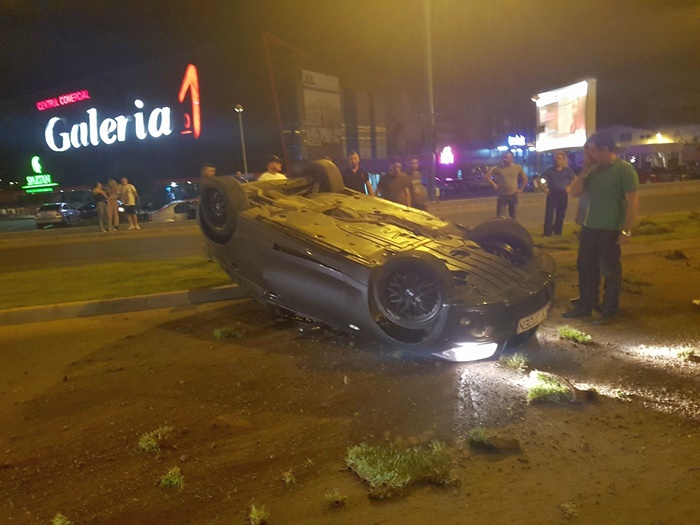 Autoturismul a izbit bordura si intr-o clipa a ajuns cu rotile-n sus in mijlocul drumului.