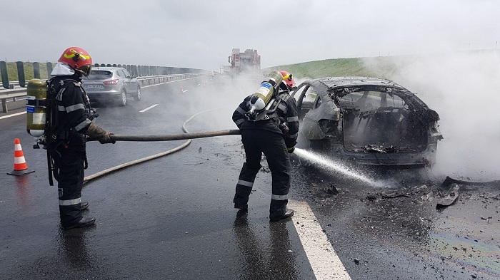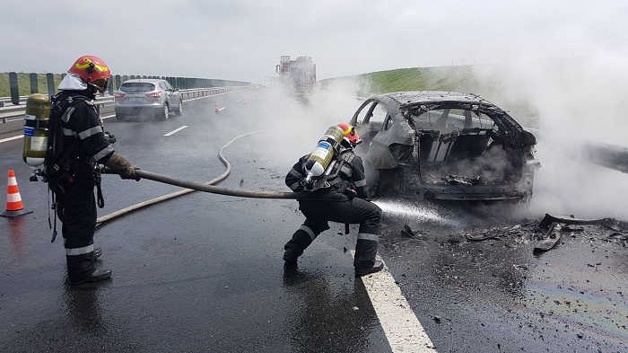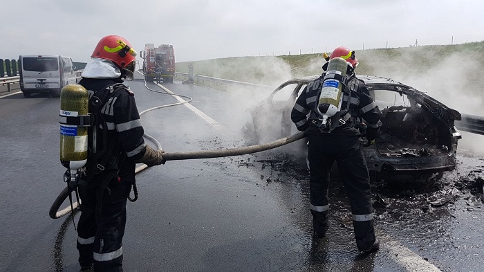 Masina in care se aflau, un BMW, a luat foc in mers, pe Autostrada A1, intre Timisoara si Lugoj.