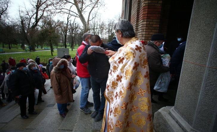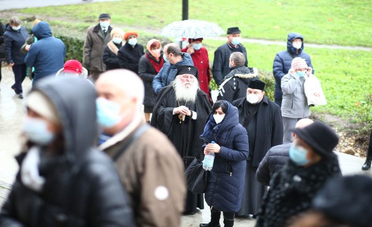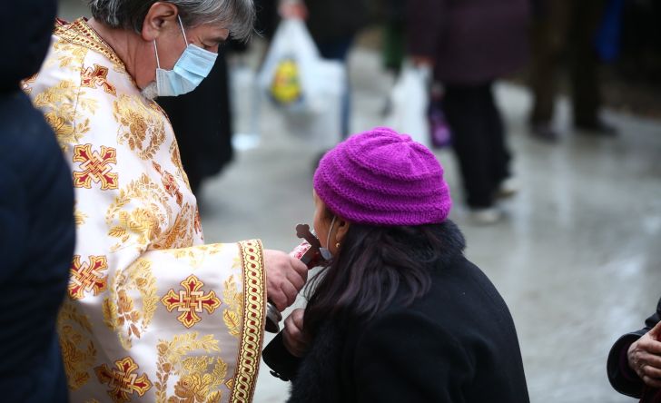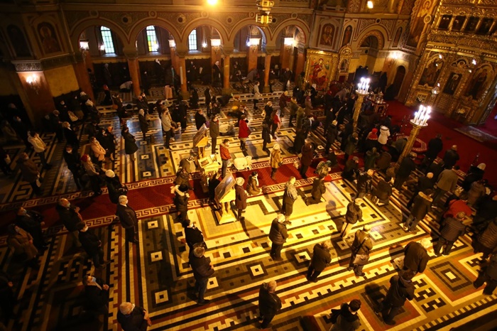 Oamenii au luat parte la slujba si s-au rugat, dupa care s-au aliniat in afara lacasului de cult pentru a primi apa sfintita, respectand distantarea si toate restrictiile impuse de pandemia de coronavirus.