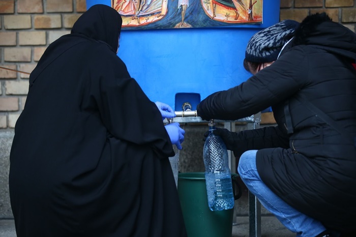 Oamenii s-au asezat la coada si au asteptat, fara sa se inghesuie, sa primeasca agheasma. Conform traditiei, apa sfintita le aduce liniste in case si ii fereste de boli tot anul.