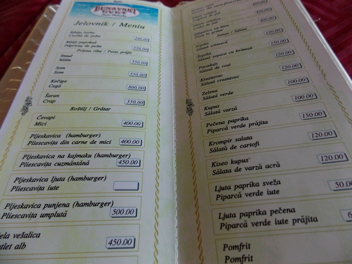 Preturile sunt incredibil de bune. De exemplu, o portie de ciorba de pește, care contine pește din belsug, costa mai putin de zece lei, in bani romanesti. Aceasta in conditiile in care o ciorba mai putin imbelsugata, pe malul romanesc al Dunarii, ajunge sa coste 15-16 lei.