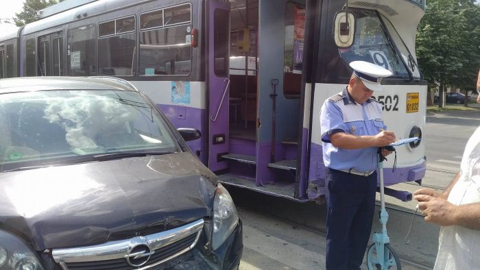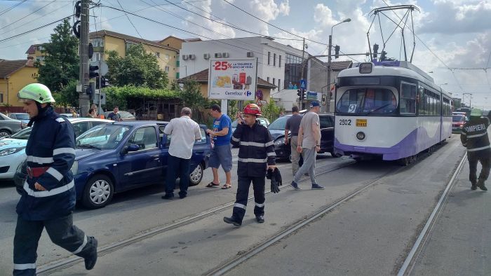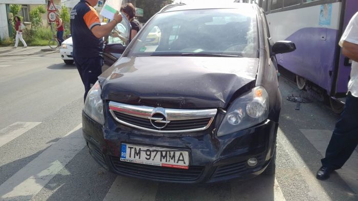 TIMISOARA. Circulatie data peste cap intr-o intersectie din Timisoara unde un sofer s-a avantat, se pare, pe culoarea rosie a semaforului. Autoturismul sau, un Opel, a izbit un tramvai. In urma impactului masina a fost proiectata intr-un Renalult si mai apoi intr-un Volkswagen.