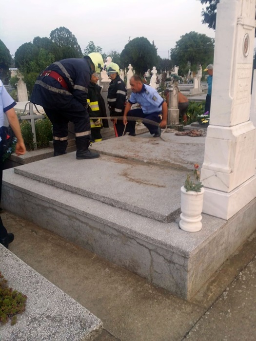 Pompierii din Sannicolau Mare au intervenit rapid pentru salvarea catelului. Operatiunea s-a desfasurat cu acordul preotului si a administratiei cimitirului.