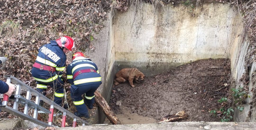 Un apel la 112 a declansat o operatiune de salvare a unui caine ce cazuse intr-un bazin de colectare a apei.