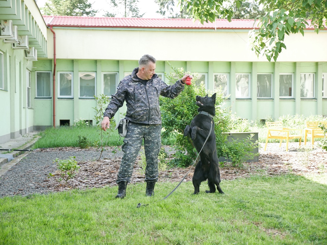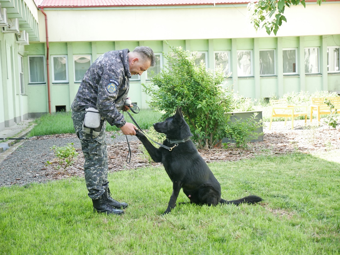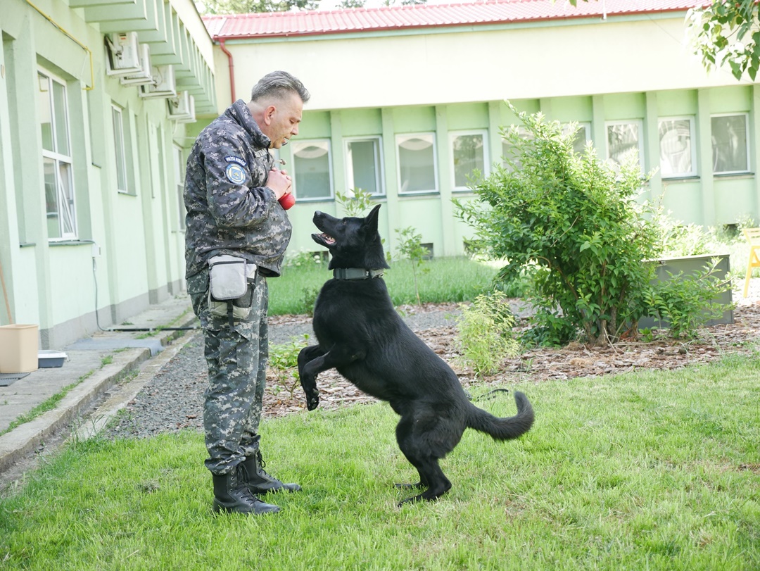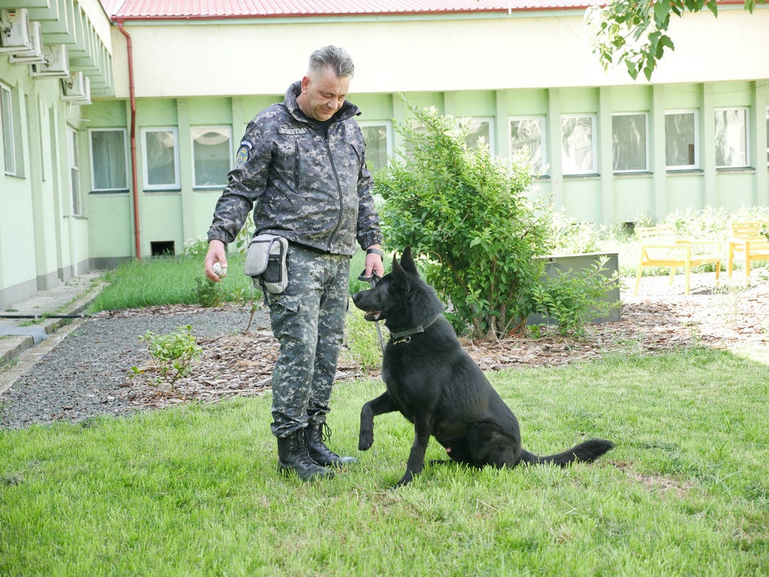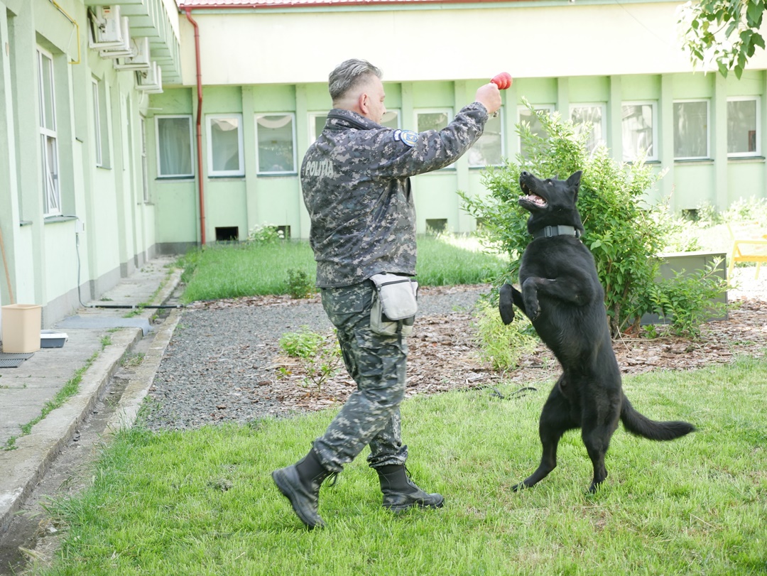 Animalul este un ciobanesc german de aproape 7 ani, care este specializat in gasirea de explozibili si diferite substante.