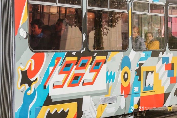 Este vorba de un tramvai care circula pe linia 8, care a fost decorat de artistii Alina Bohoru si Mircea Popescu. Anul Revolutiei, chipurile oamenilor care scandeaza ‘Libertate’ sau ori celebrul semn al victoriei sunt doar cateva dintre elementele pictate pe garnitura, ce amintesc de acel Decembrie din urma cu 30 de ani la Timisoara.
