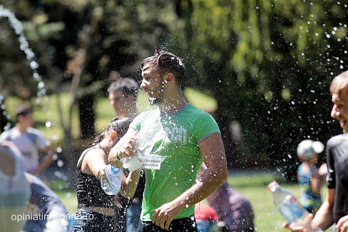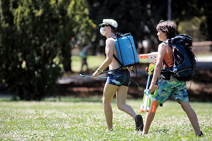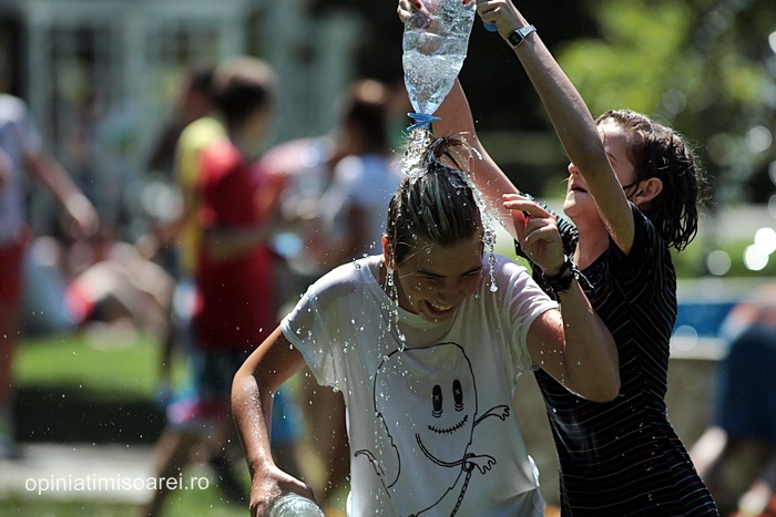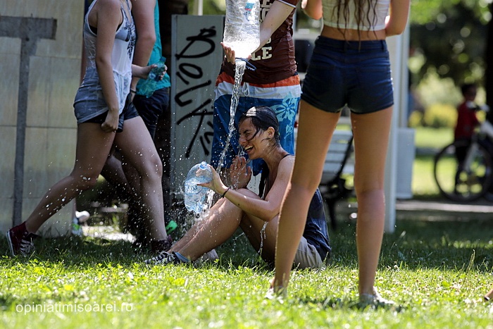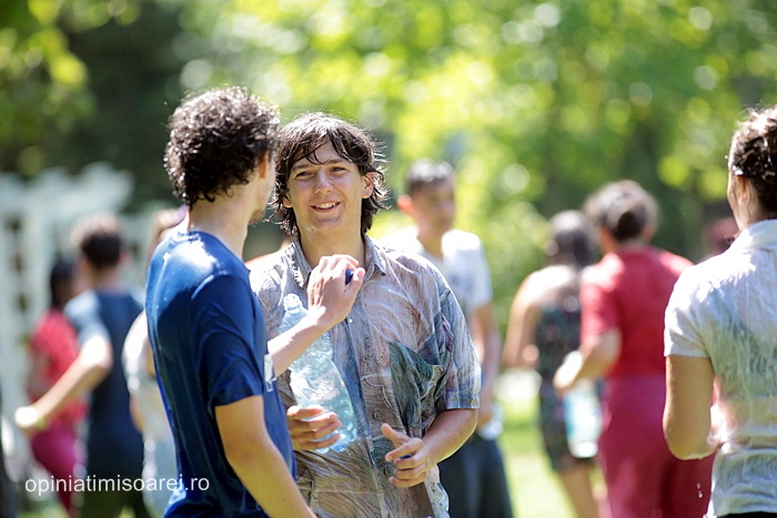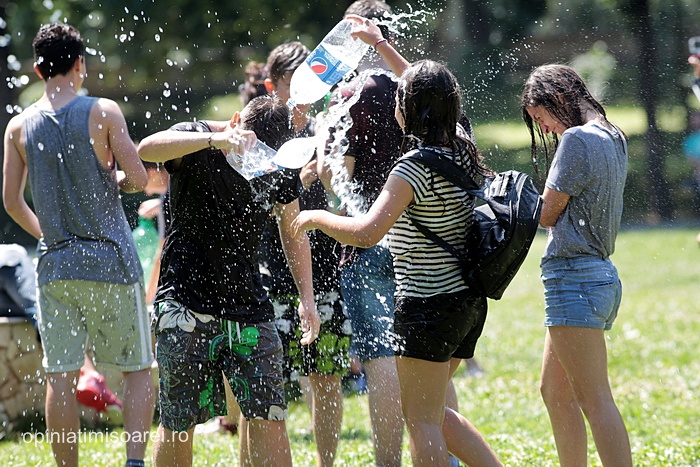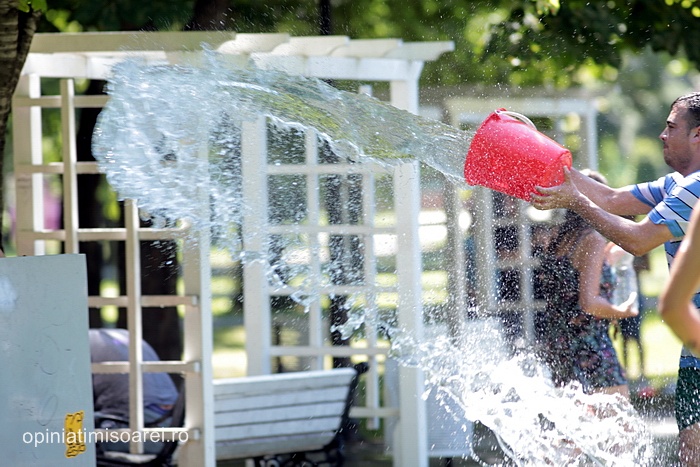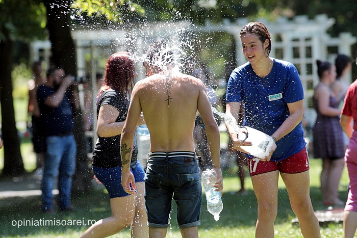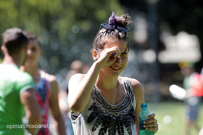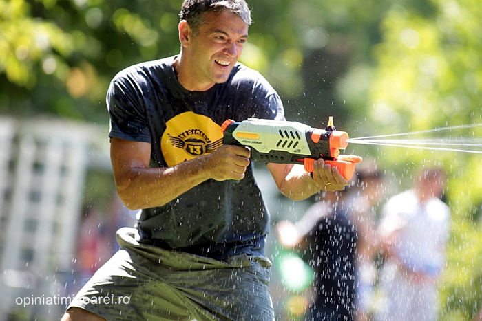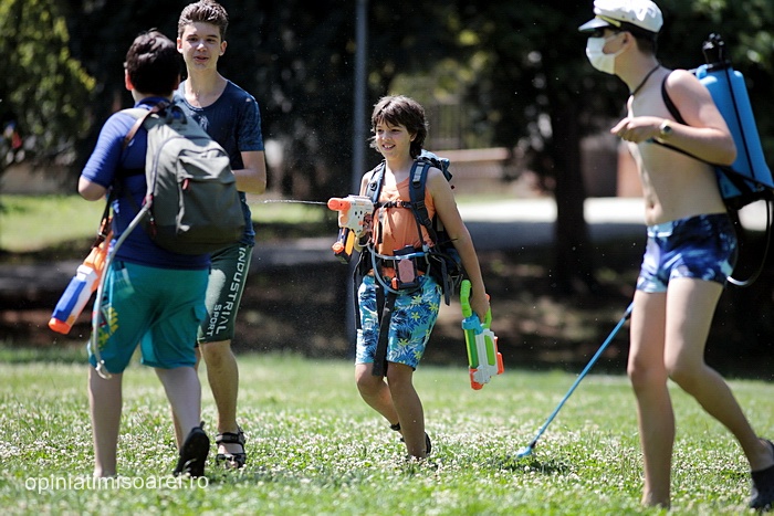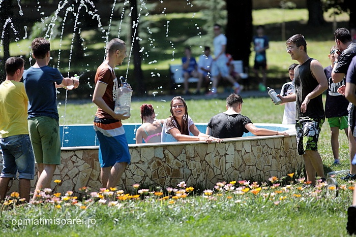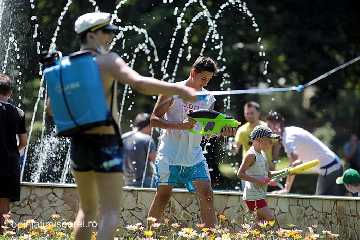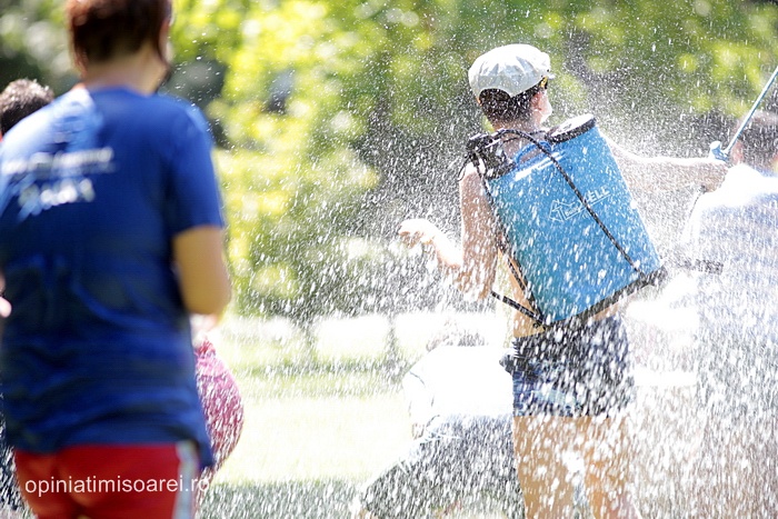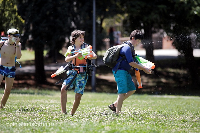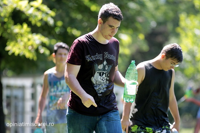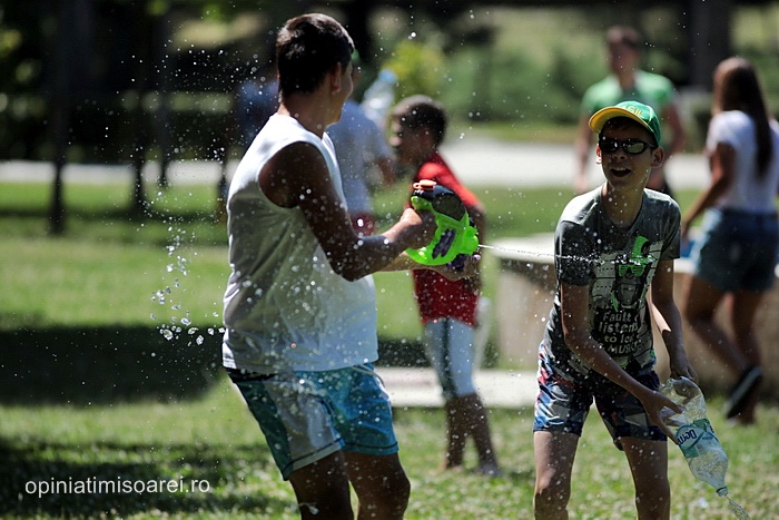 TIMISOARA. Zeci de tineri inarmati cu pistoale cu apa, galeti sau bidoane pline cu apa s-au adunat in Parcul Central din Timisoara pentru a participa la ceea ce urma sa fie “cea mai mare bataie cu apa” din oras.