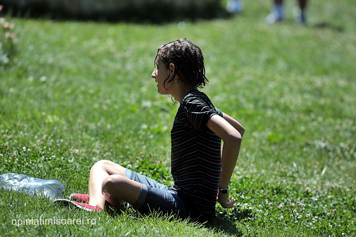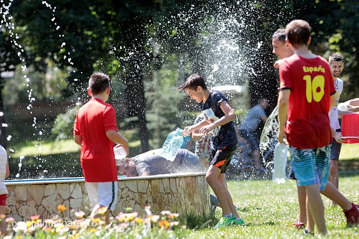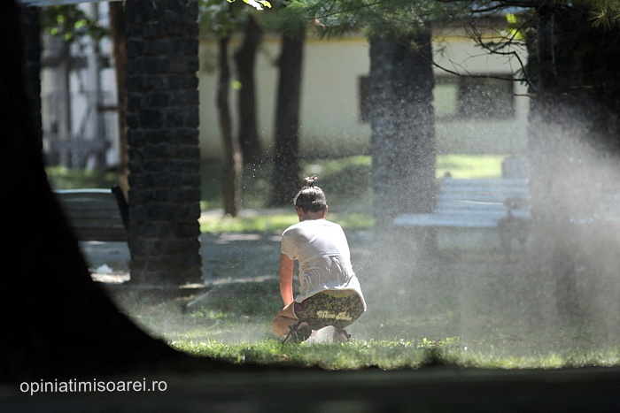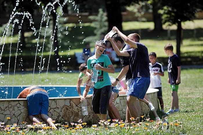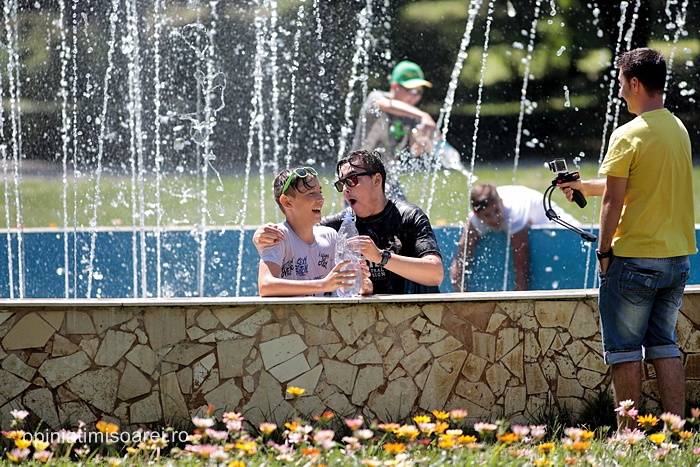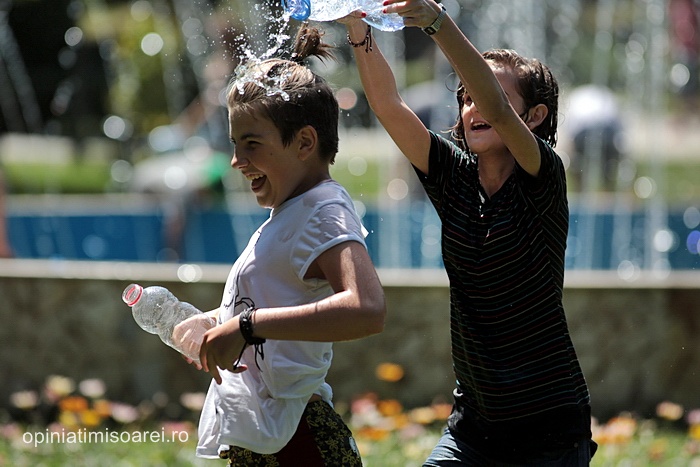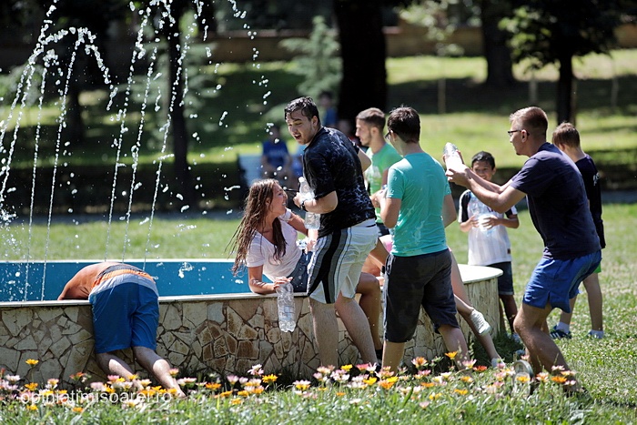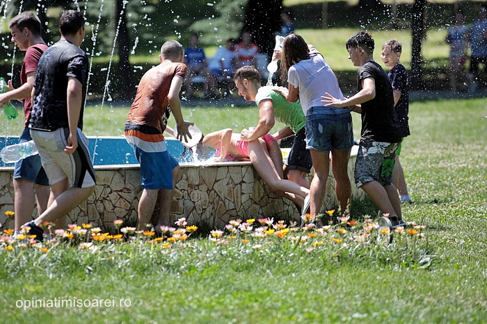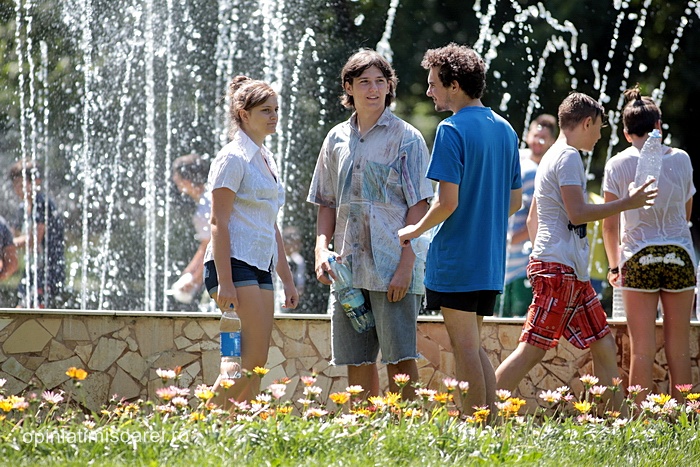 In scurt timp, in jurul fantanii din parc s-a dezlantuit “potopoul”. Tinerii si-au turnat apa in cap, s-au improscat cu apa si s-au fugarit prin parc.