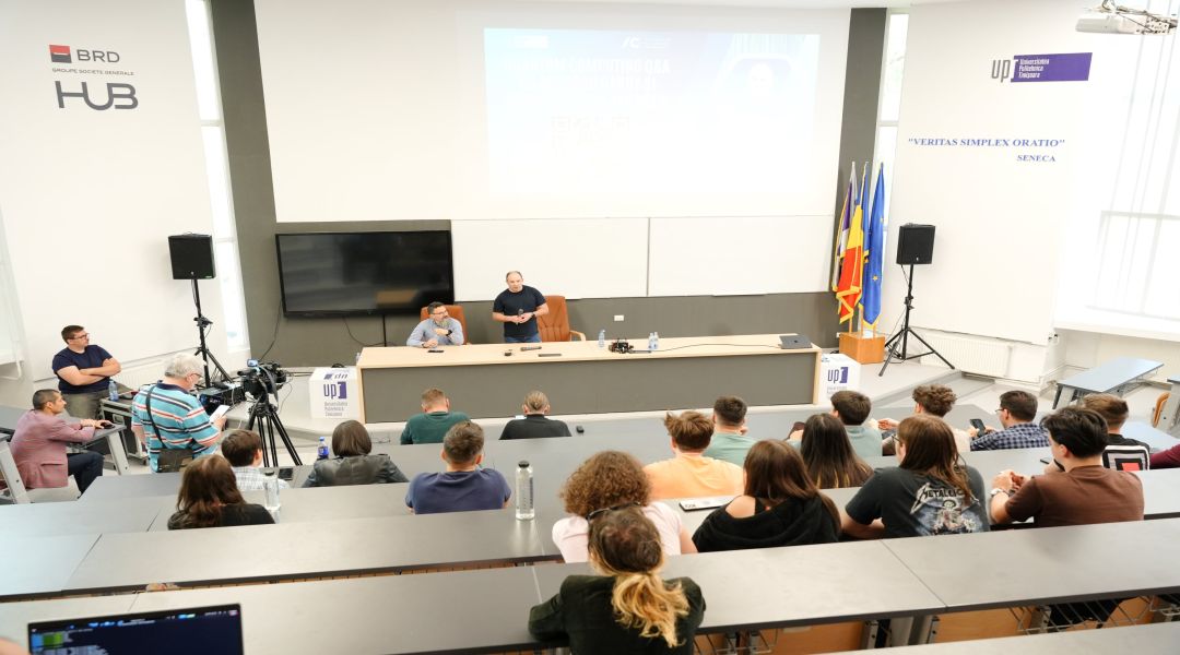 În prima parte, pasionații de tehnologii cuantice au participat la o sesiune specială de „Quantum Computing Q&A” cu Brendan Barry, având ca moderator pe Mihai Udrescu-Milosav, cadru didactic al UPT, care a susținut primul doctorat în calculatoare cuantice din România.