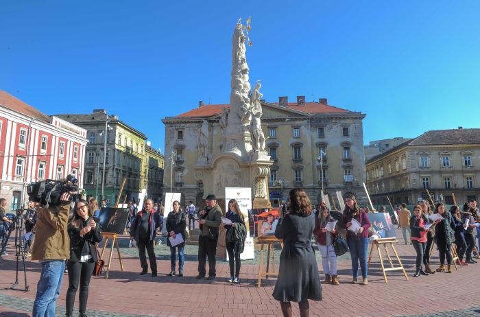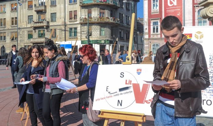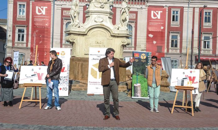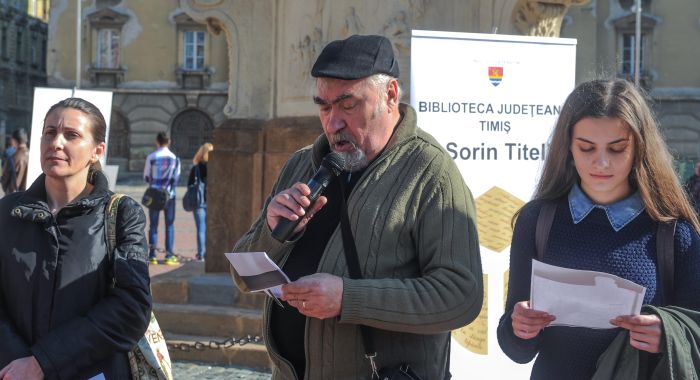 TIMISOARA. ”Ca un vagabond intr-o flanela rosie” al poetului timisorean Ion Monoran, aceasta a fost cartea citita la microfon, in Piata Libertatii din Timisoara de scriitori, cu ocazia aniversarii a 111 ani ai Bibliotecii Judetene imis „Sorin Titel”.