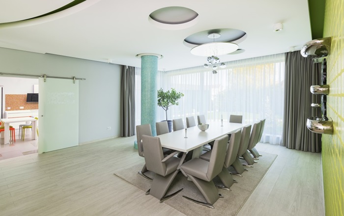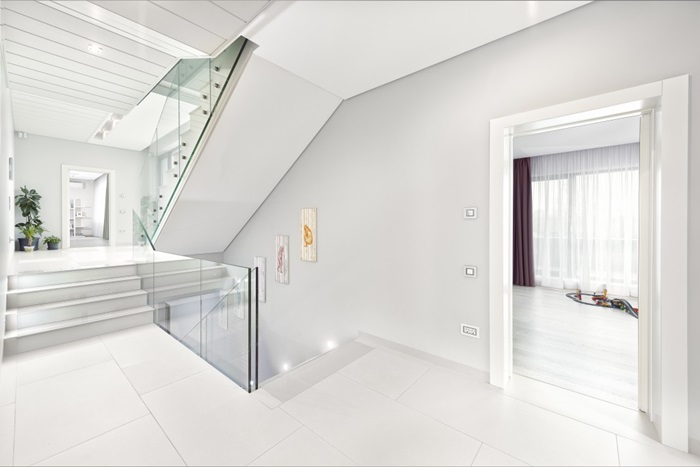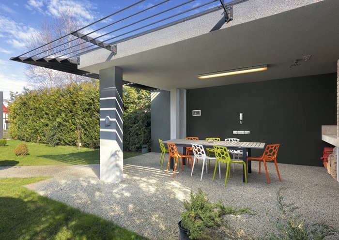 Pe langa dormitoarele imense, decorate in linii moderne, casa are mai multe locuri de servit masa, o biblioteca impresionanta si o terasa exterioara. Curtea interioara pastreaza acelasi design simplu, in linii drepte, la fel ca intreaga proprietate.