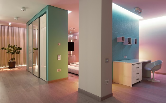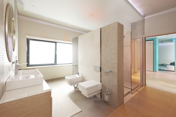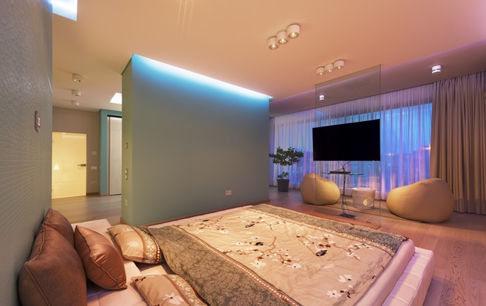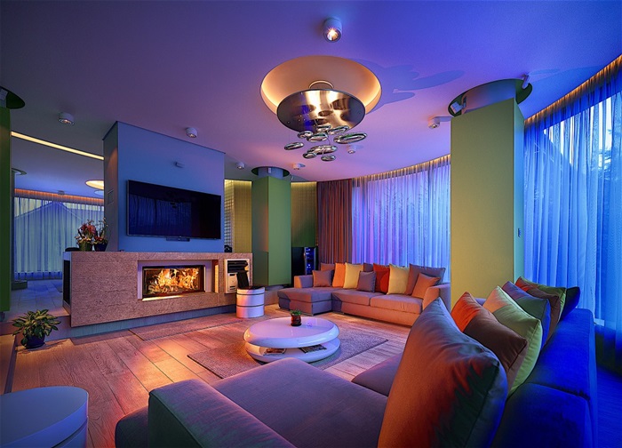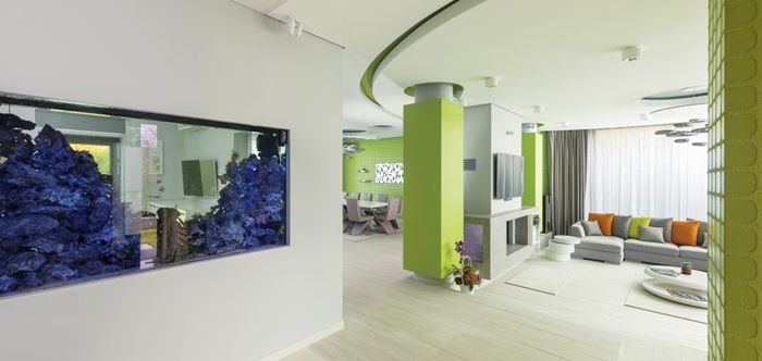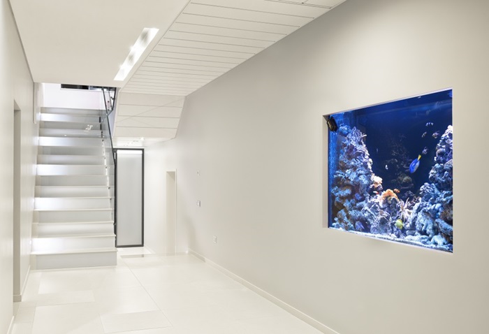 Cei care au construit casa au fost foarte atenti si la detalii. Astfel, in zona de spa a fost realizat si un tavan de sticla, pentru ca lumina naturala sa poata patrunde in incapere, iar in peretii locuintei au fost amplasate acvarii cu pesti exotici.