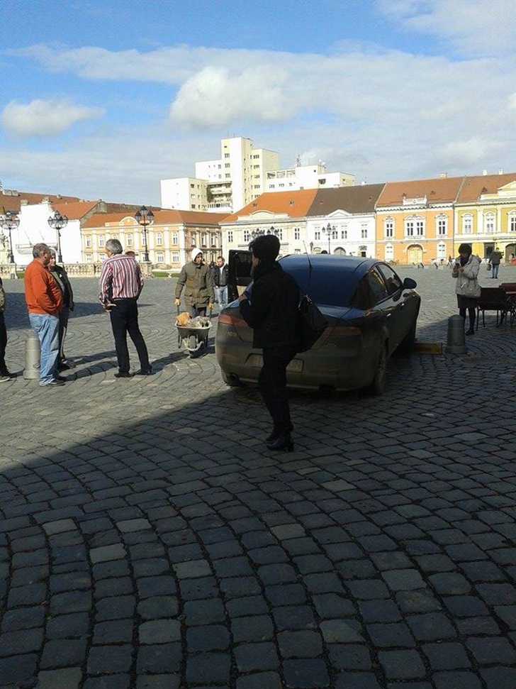 TIMISOARA. A fost show in Piata Unirii din Timisoara, marti, inainte de pranz. O inexplicabila manevra facuta de un sofer l-a transformat pe acesta intr-un adevarat cascador, la intrarea in piata de la intersectia Augustin Pacha cu Palanca.