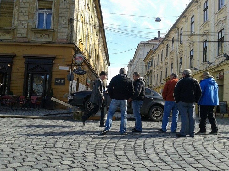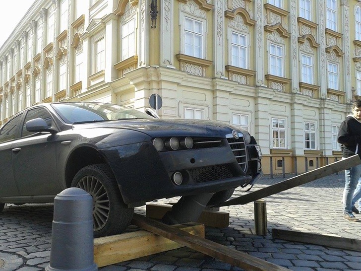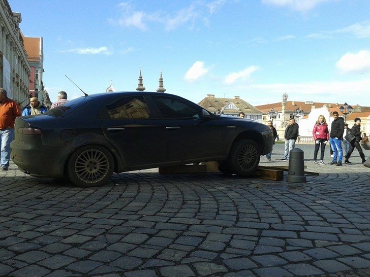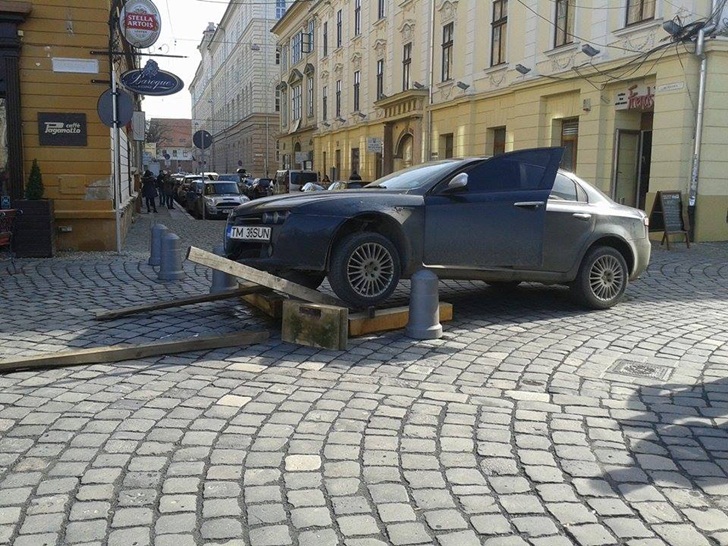 Omul a reusit performanta de a se urca cu o nervoasa Alfa Romeo pe unul dintre stalpii pozitionati acolo tocmai pentru a limita accesul auto.