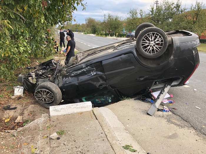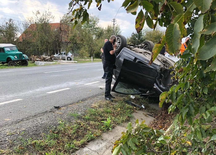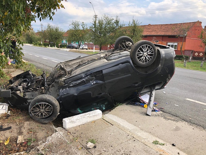 La un moment dat, tanarul a pierdut controlul volanului, iar masina a izbit un cap de podet si a ajuns cu rotile-n sus pe marginea soselei.