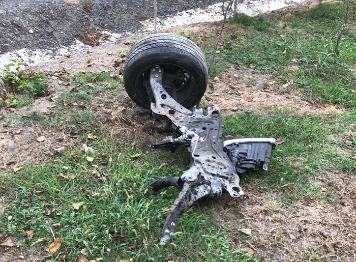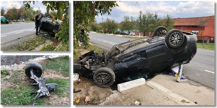 Masina a suferit avarii serioase, o roata a zburat la cativa metri cu tot cu brat.