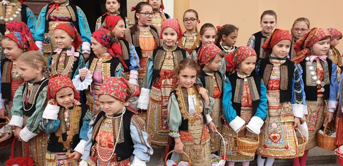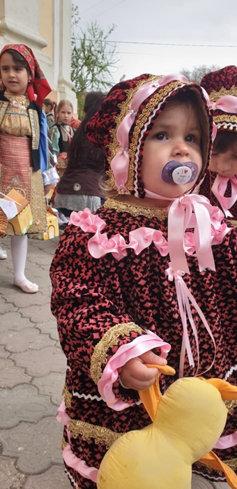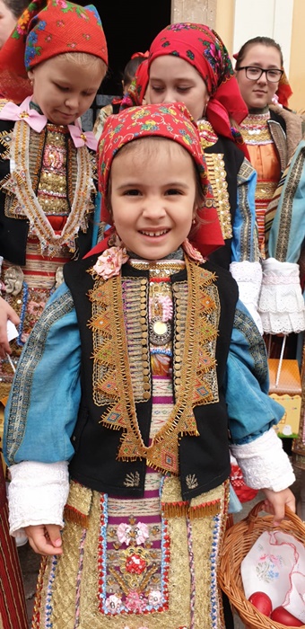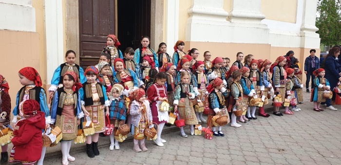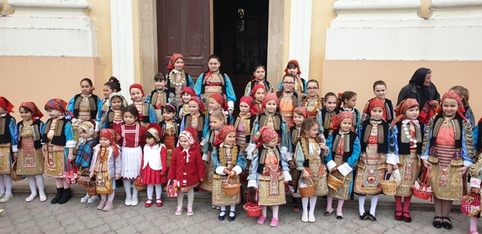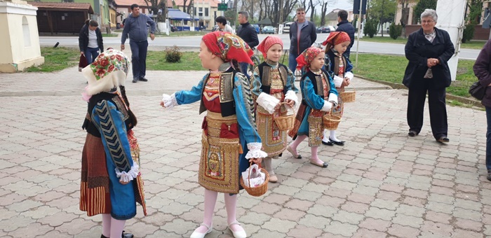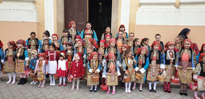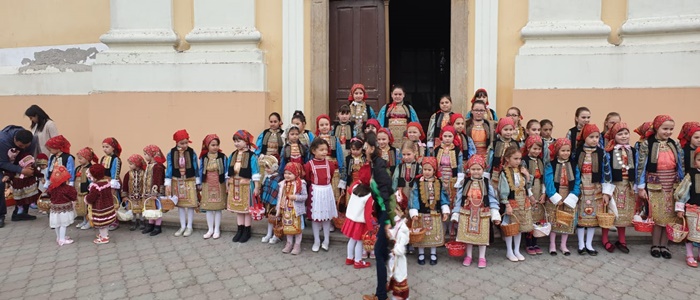 Imbracate in costumele de sarbatoare, fetitele sunt superbe si par niste papusi vii, asezate in pragul bisericii din localitate, pe cand vestesc sarbatoarea de Florii la catolici, care are loc duminica.