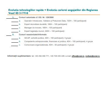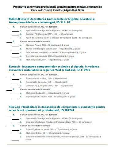 programe de pregătire profesională continuă pentru actualizarea competențelor digitale, de dezvoltare durabilă și antreprenoriale în concordanță cu schimbările și nevoile pieței muncii din Regiunea Vest.