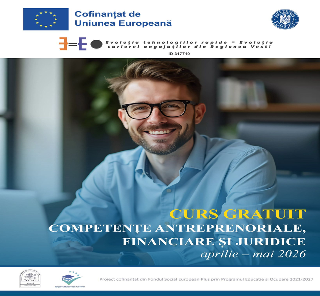 TIMISOARA. Camera de Comerț, Industrie și Agricultură Timiș face înscrieri pentru o nouă serie a cursului GRATUIT de Competențe antreprenoriale, financiare și juridice, autorizat conform O.G. nr. 129/2000, organizat în cadrul Proiectului ”Evoluția Tehnologiilor Rapide = Evoluția Carierei Angajaților din Regiunea Vest” (ID 317710), co-finanțat din Fondul Social European Plus prin Programul Educație și Ocupare 2021-2027, Prioritatea P9. Consolidarea participării populației în procesul de învățare pe tot parcursul vieții pentru facilitarea tranzițiilor și a mobilității, Operațiunea Implementarea programului „Ține pasul”.