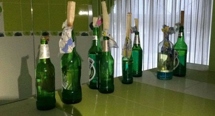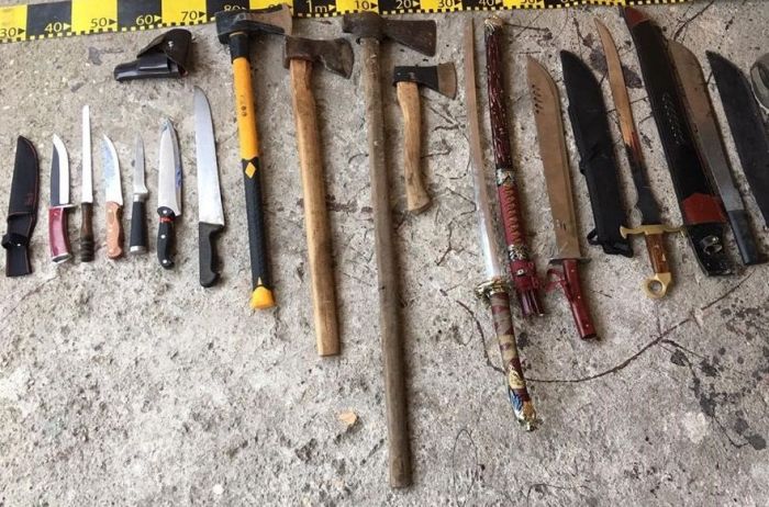 In urma perchezitiilor, au fost descoperite si ridicate 19 arme albe (8 sabii, 7 cutite si 4 topoare), 22 de sticle incendiare, un pistol si 13 cartuse.