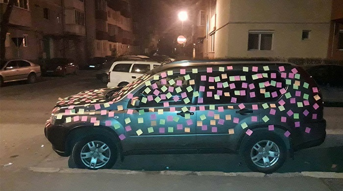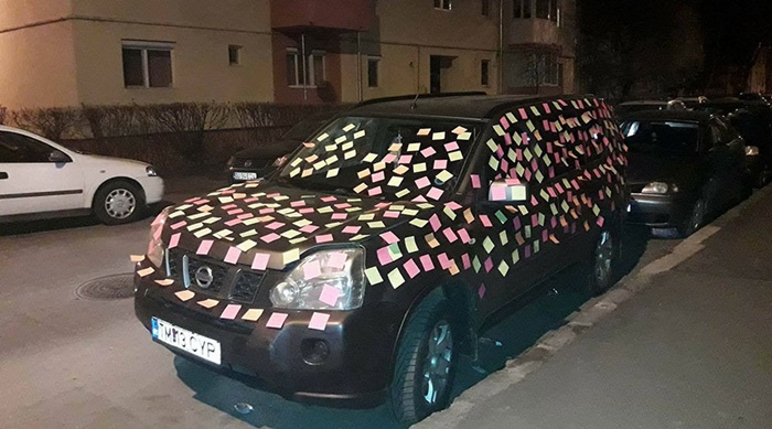 A scris mesaje de iubire pe sute de stickere pe care mai apoi le-a lipit pe masina baiatului aflata in parcarea unui bloc din zona Aurora.