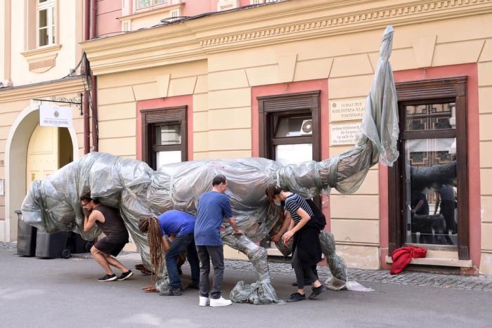 TIMISOARA. Trecatorii si-au scuipat in san si s-au intrebat ce “scarbosenie” mai e si asta si de ce e plimbata prin centrul orasului. Este vorba de o “creatura” maro, cu limba albastra, ce are mai multi ochi si maini umane in loc de picioare. Aduce a dinozaur, dar nu este un dinozaur, si a fost asezata in Piata Unirii din Timisoara.