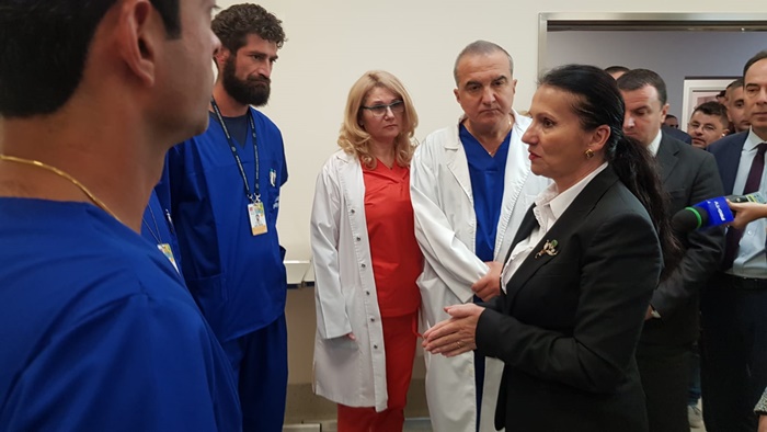 “De cand am intrat, zambesc, pentru ca in sfarsit avem un centru pentru Mari Arsi care poate sa trateze acest pacient in conditii absolut optime, pentru patologia aceasta. Am vazut centre din strainatate si sunt atat de mandra ca acest centru este identic si poate chiar la un nivel superior. Este foarte important ca acest centru, de maine, va putea sa primeasca pacienti, ca are medici si personal, mediu pregatit pentru a trata acest tip de pacient, ca Ministerul Sanatatii, autoritatile locale si spitalul au realizat aceasta minune. Este o zi istorica, practic sunt primele paturi care corespund cu adevarat tuturor standardelor. Am vrut ca atunci cand dam drumul, de maine sa poata intra pacientul. Pentru spitalul din Timisoara s-a aprobat functionarea a inca doua linii de garda pe acest centru si inca doua posturi de medici specialitatea chirurgie plastica, tot pentru acest centru. Sunt 5 boxe, trei vor fi functionale imediat si doua imediat dupa ce Consiliul Judetean va semna receptia, deci nu am putut spune ca sunt functionale, decat in momentul in care vor putea intra pacientii. dar daca va fi nevoie si vom avea pacienti care vor necesita ingrijiri imediate, eu sunt convinsa ca nu ne vom impiedica de o foaie de hartie. Cat de curand va fi semnata receptia, pentru ca sunt lucrari facute de catre Consiliul Judetean, de asta spuneam, Consiliul Judetean si Ministerul Sanatatii au realizat minuni“, a declarat ministrul Sanatatii Sorina Pintea la Timisoara.