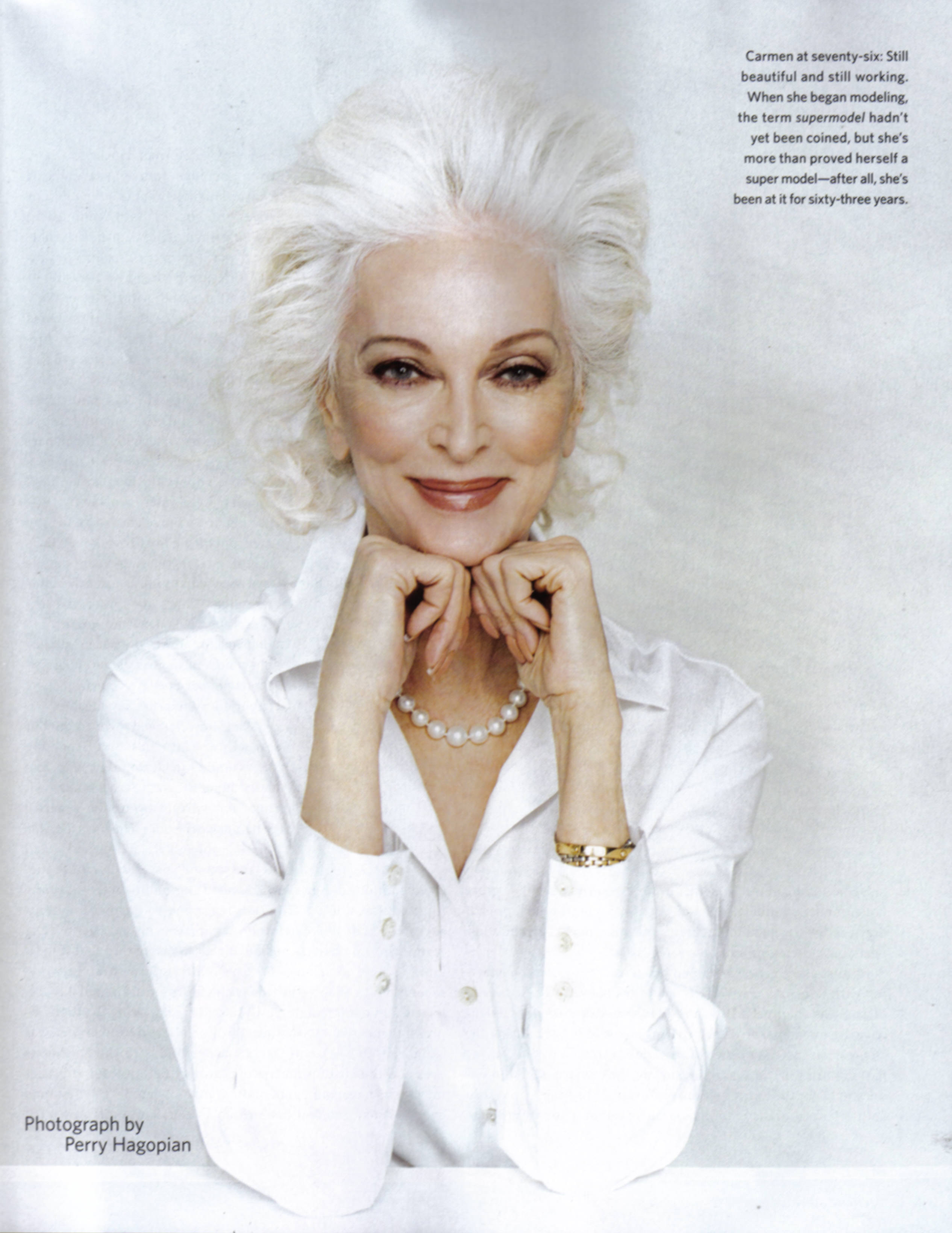 In cariera sa de 66 de ani, Carmen Dell’Orefice a aparut pe coperta celebrei reviste de sase ori si a fost reprezentanta a 14 campanii publicitare pentru produse cosmetice.