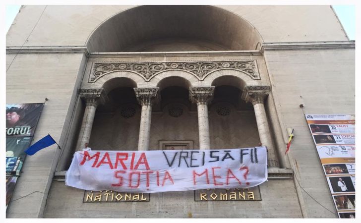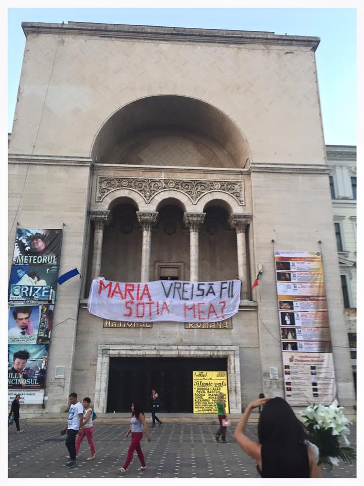 Cu ajutorul unor prieteni, tanarul Emanuel Dascaliuc a pus la cale o cerere in casatorie iesita din tipare. Pe un banner improvizat a scris marea intrebare, i-a dat iubitei sale Maria Negrea intalnire in Piata Victoriei, au mers la un spectacol, iar la pauza, amicii sai l-au agatat de balconul Operei.