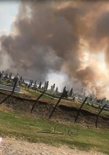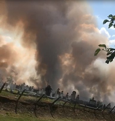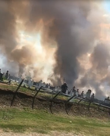 Flacarile au inconjurat aproape cimitirul aflat in apropierea terenurilor cultivate care au luat foc.