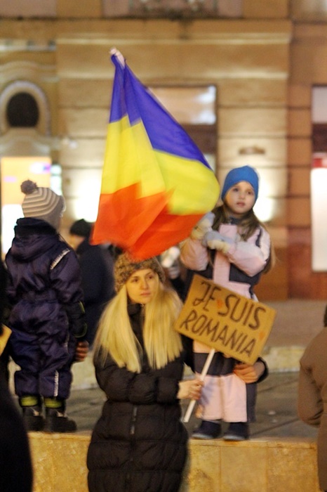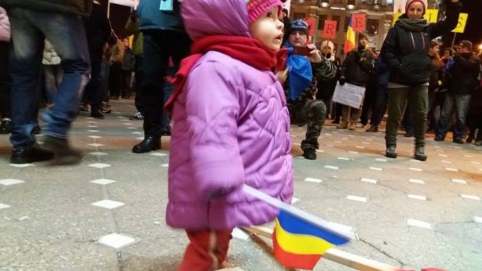 Cel mai mic dintre protestatarii de la Timisoara este o fetita care a venit cu mama ei la protest. Copila abia a invatat sa mearga, insa a purtat in maini un steag tricolor.