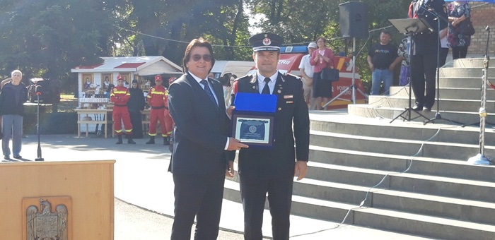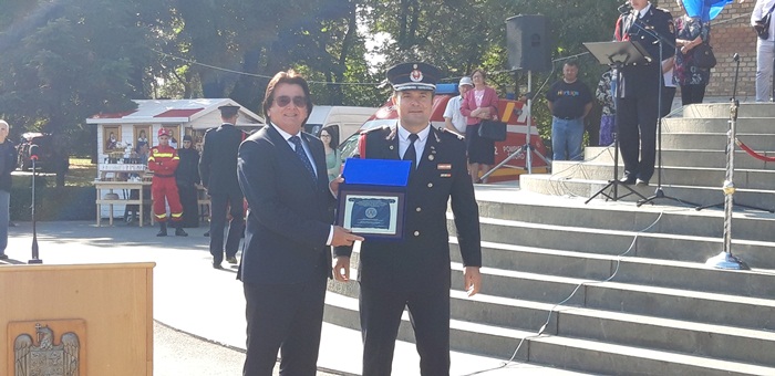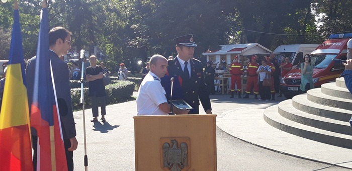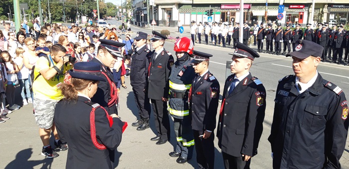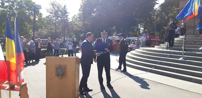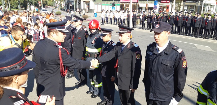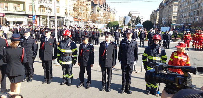 La ceremonialul militar din centrul Timisoarei au participat oficialitati locale si judetene, dar si doua delegatii ale pompierilor din Cehia, din Moravia de Sud, si din Franta, din regiunea Moulhouse, care au primit plachete de onoare din partea ISU Timis.