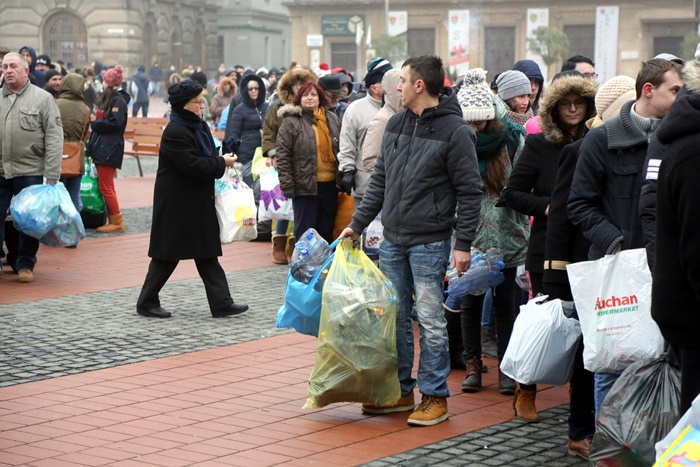 O coada imensa s-a format inca inainte de ora 11, cand incepea actiunea. Cu pungi si saci intregi de PET-uri, timisorenii s-au asezat la rand in asteptarea preluarii copaceilor.