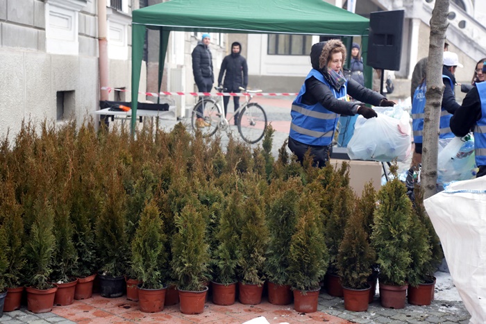 UPDATE: La orele 11.20, s-au epuizat toti cei 1000 de copacei, dar oamenii continua sa vina sa aduca saci cu PET-uri. Chiar daca nu mai sunt tuia de luat, timisorenii lasa sticlele de plastic la organizatori pentru a fi preluate.