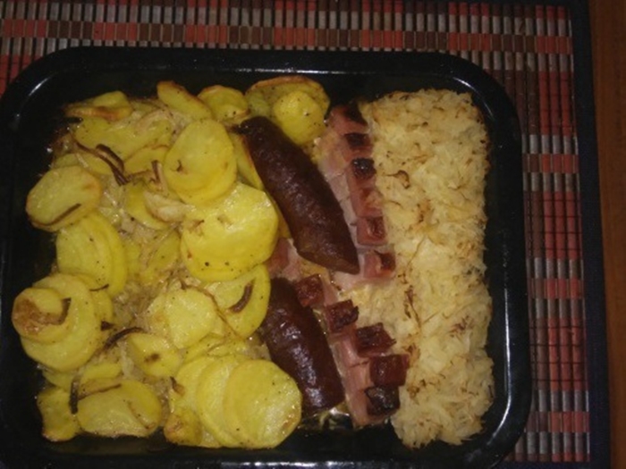 Pentru a gati aceast mancare aveti nevoie de trei cartofi taiati rondele, o ceapa taiata fidelute, doua felii de costita proaspata, 300 de grame de varza acra, o felie de dovleac, 100 de grame de untura sau ulei si 100 de mlilitri de smantana lichida.