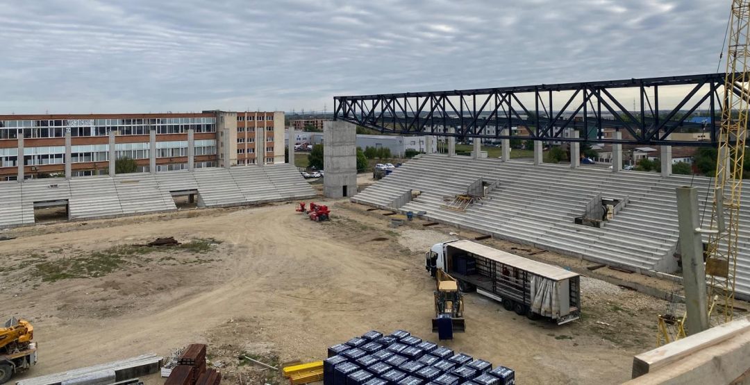 Constructorul execută momentan lucrări la structura de beton a noului stadion, respectiv la placa peste etajul al doilea, precum și la pereții de compartimentare din Tribuna I și la rețeaua de canalizare interioară. În paralel, structura metalică a acoperișului pentru Peluza Vest și Tribuna II este în curs de fabricare și urmează să fie montată, etapizat, în perioada următoare.