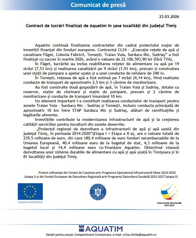 Contract de lucrări finalizat de Aquatim în șase localități din județul Timiș