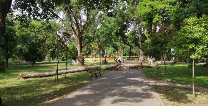 TIMISOARA. Imagine de infarct in Parcul Copiilor din Timisoara unde trunchiul unui copac uscat s-a prabusit peste o alee. Doar lipsa copiilor din parc a facut sa nu aiba loc o nenorocire.