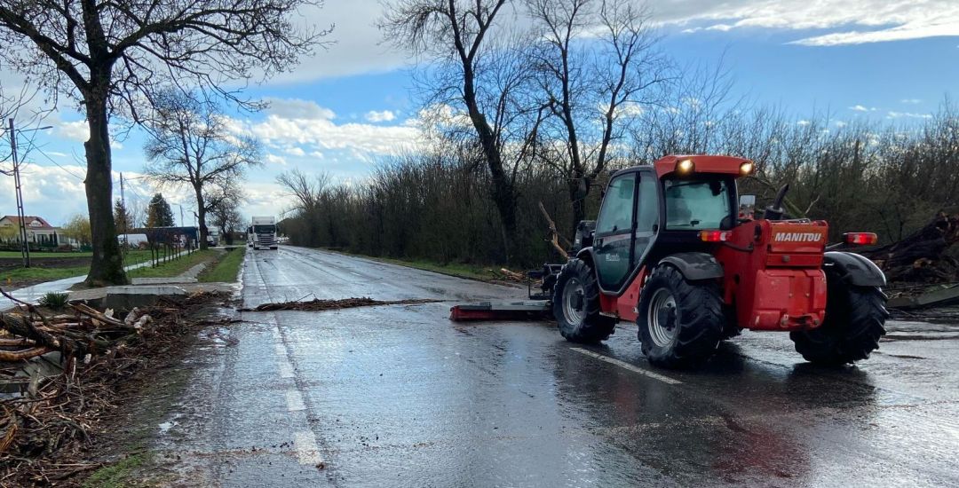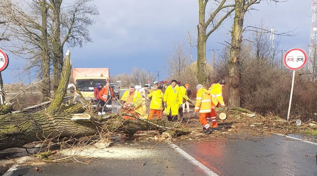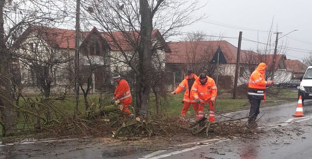 Copacii doborâți de rafale au căzut peste șosele, iar angajații DRDP Timișoara au intervenit pentru eliberarea drumurilor.