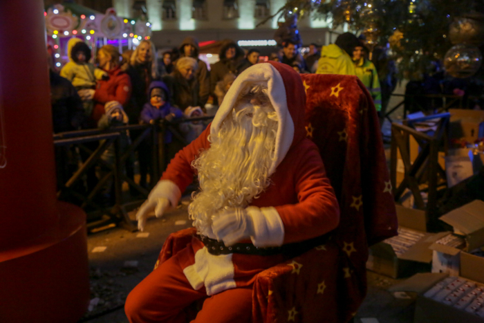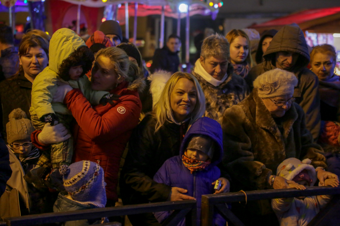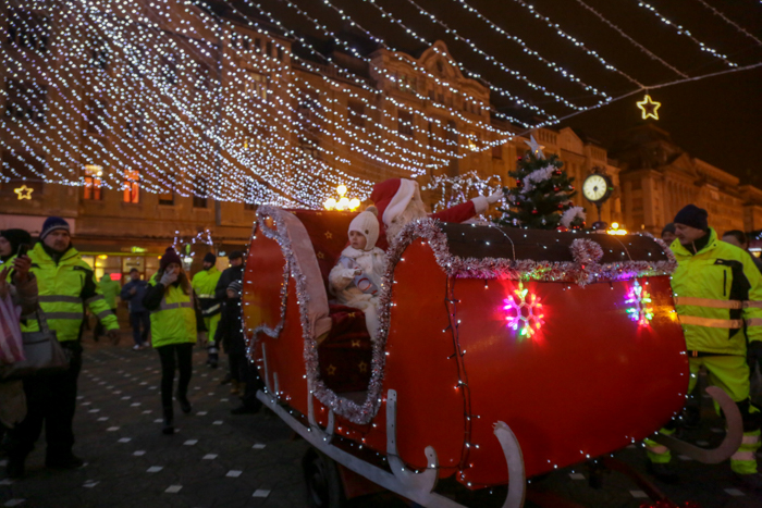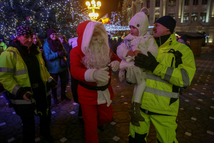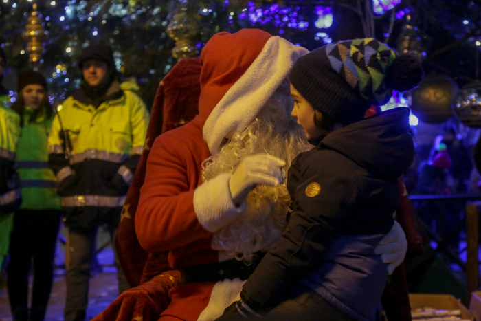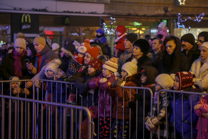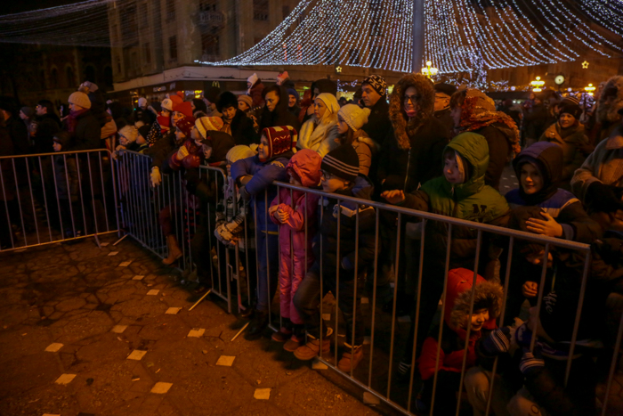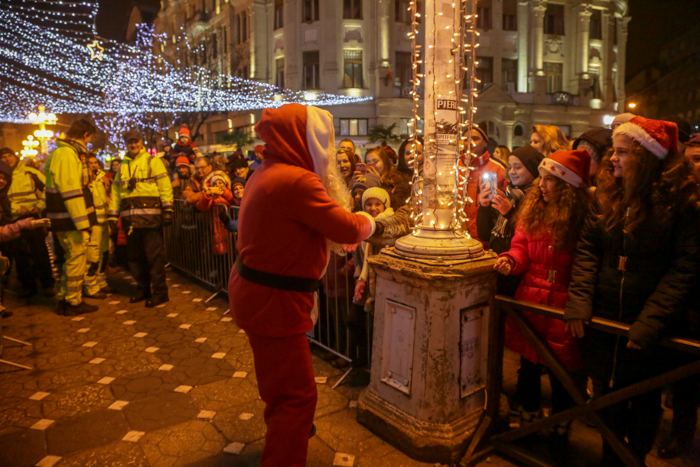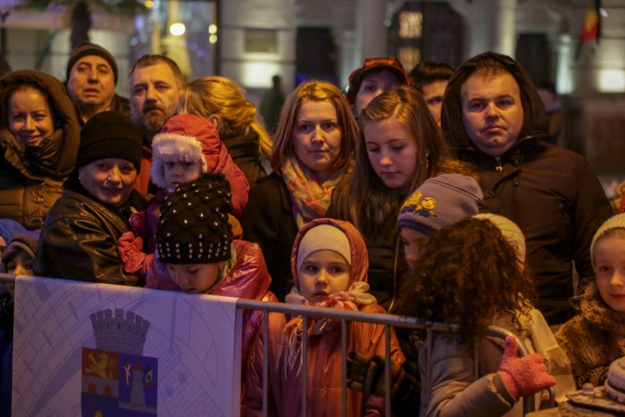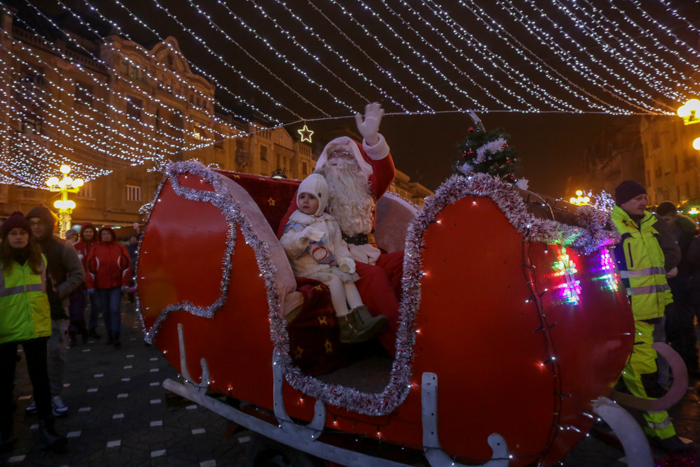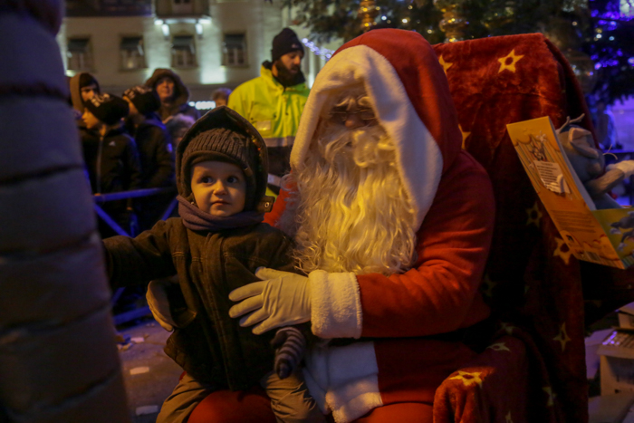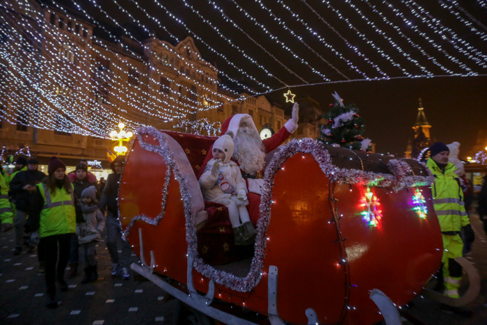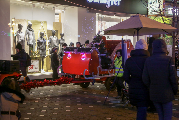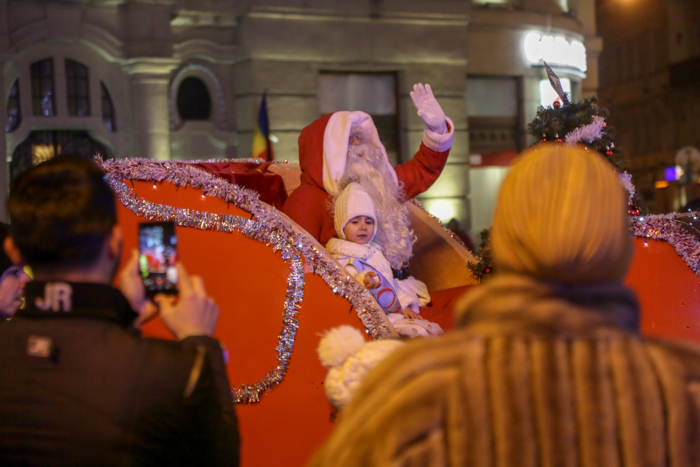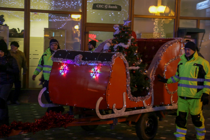 Mos Craciun si-a facut aparitia intr-o sanie rosie ca focul in care avea asezat si un bradut impodobit. Mosul a fost rabdator si a impartit cadorui, a salutat oamenii adunati in centrul orasului si chiar a stat la poze.