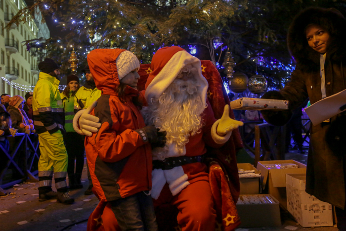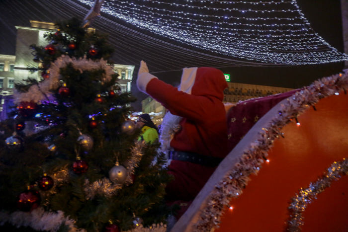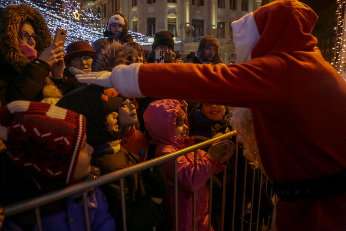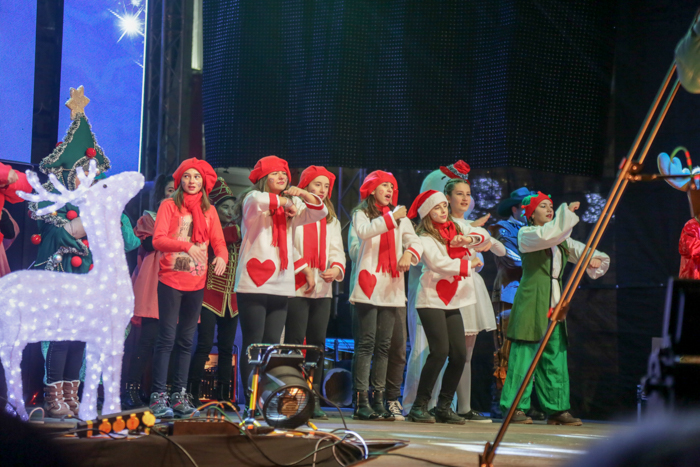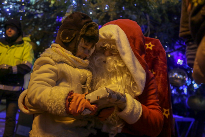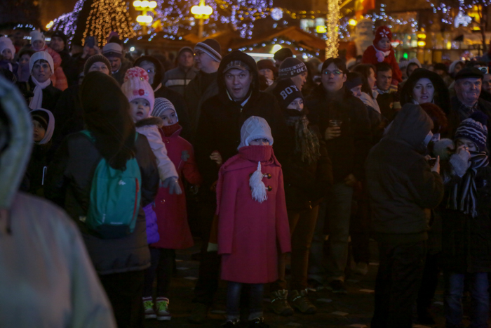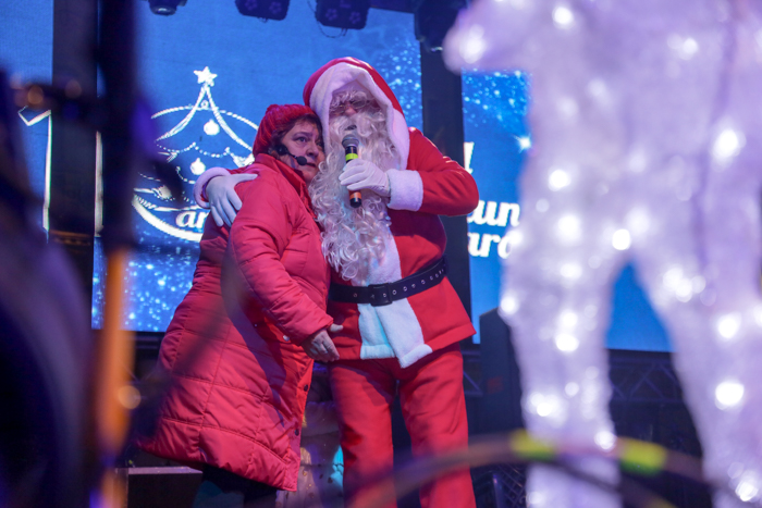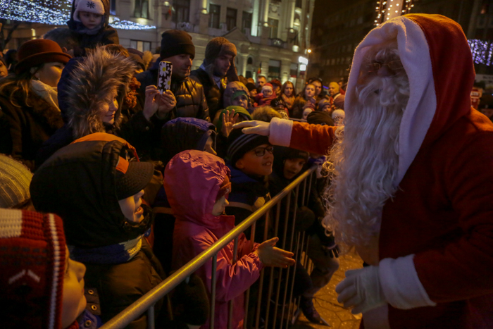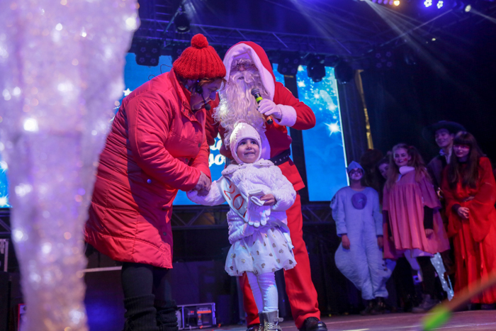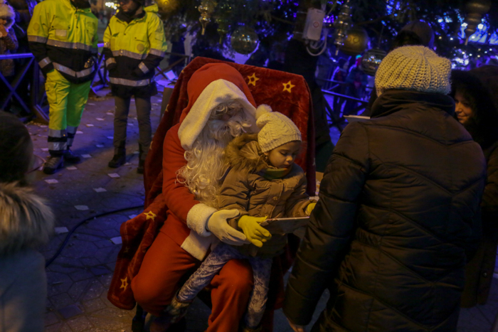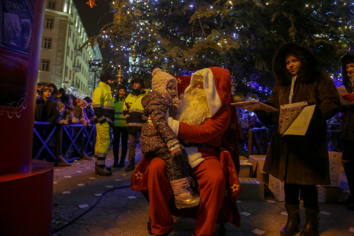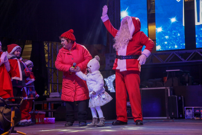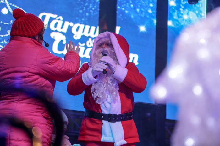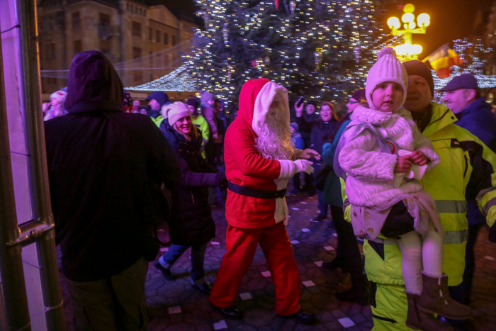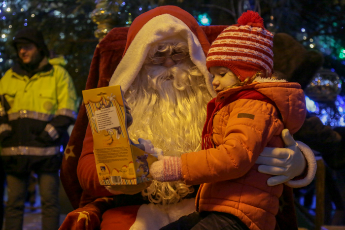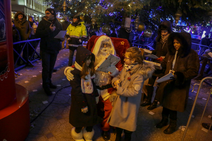 Mos Craciun si-a facut aparitia intr-o sanie rosie ca focul in care avea asezat si un bradut impodobit. Mosul a fost rabdator si a impartit cadorui, a salutat oamenii adunati in centrul orasului si chiar a stat la poze.
