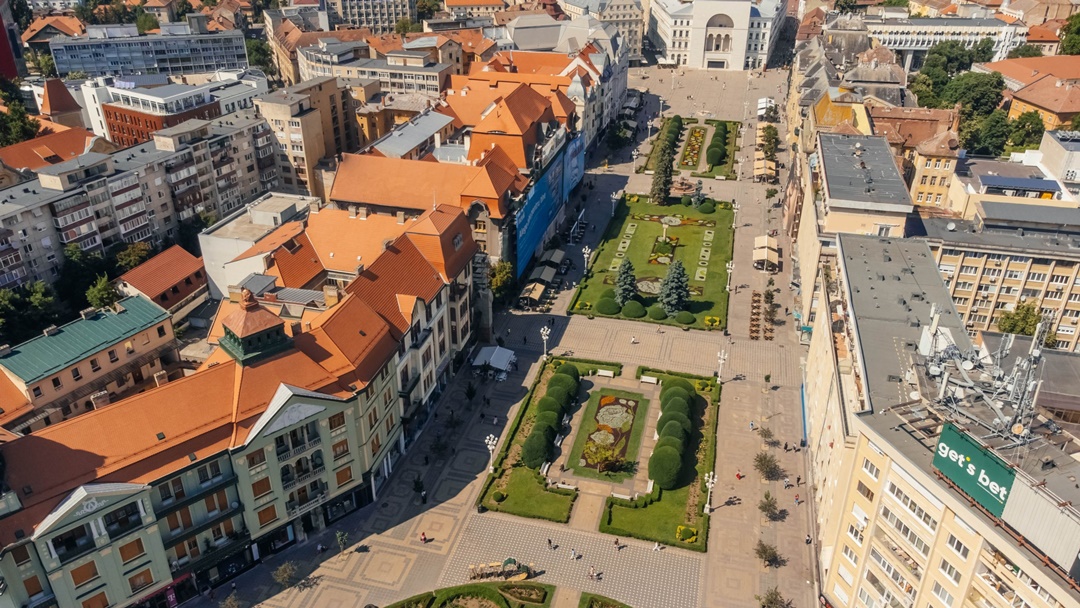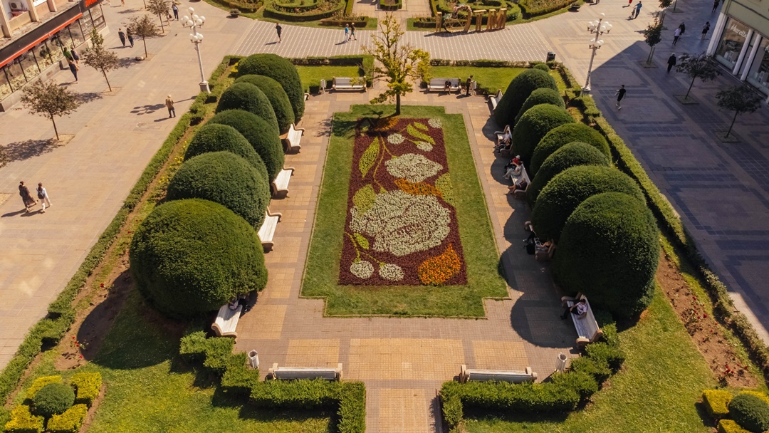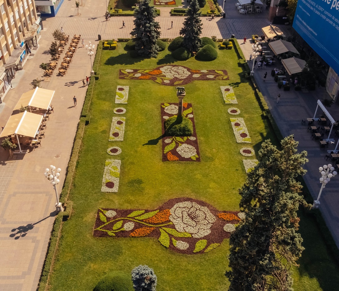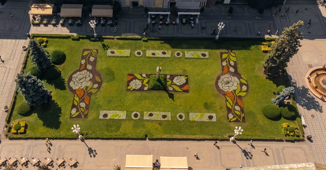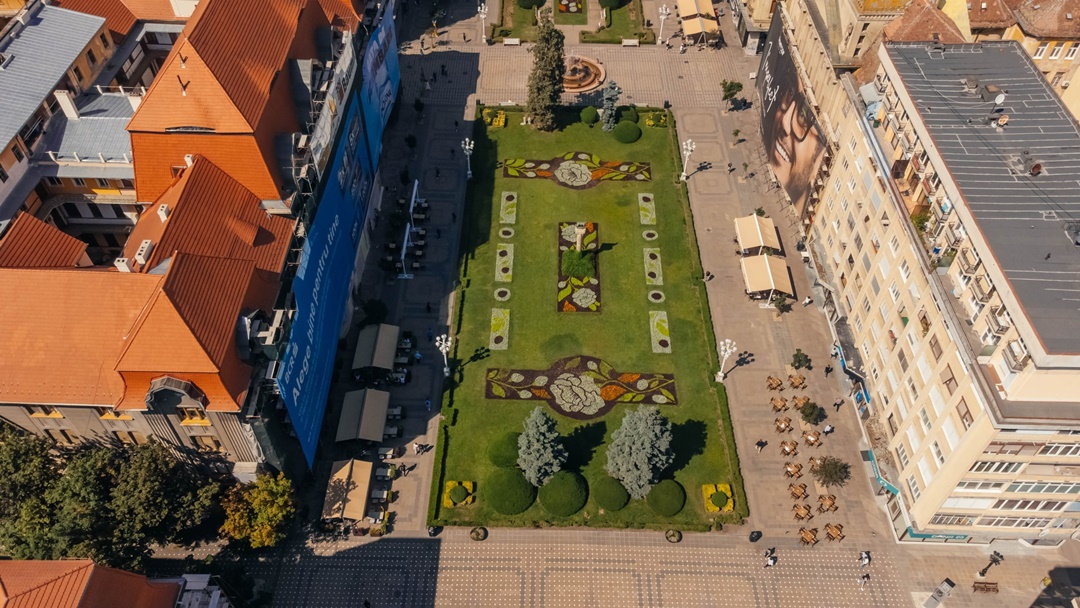 Muncitorii de la Horticultura au realizat in ultimele zile un covor floral intre cele doua cladiri reprezentative ale orasului, Catedrala Mitropolitana si Opera Romana, inspirat din floarea nationala, bujorul.
